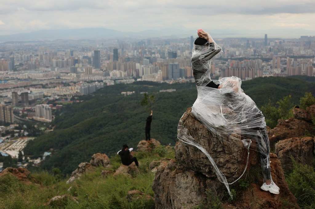 “通感——第九届‘在云上’国际现场艺术节”,艺术家们在自然里进行即兴表演,昆明长虫山,2021年,图片来源:和丽斌